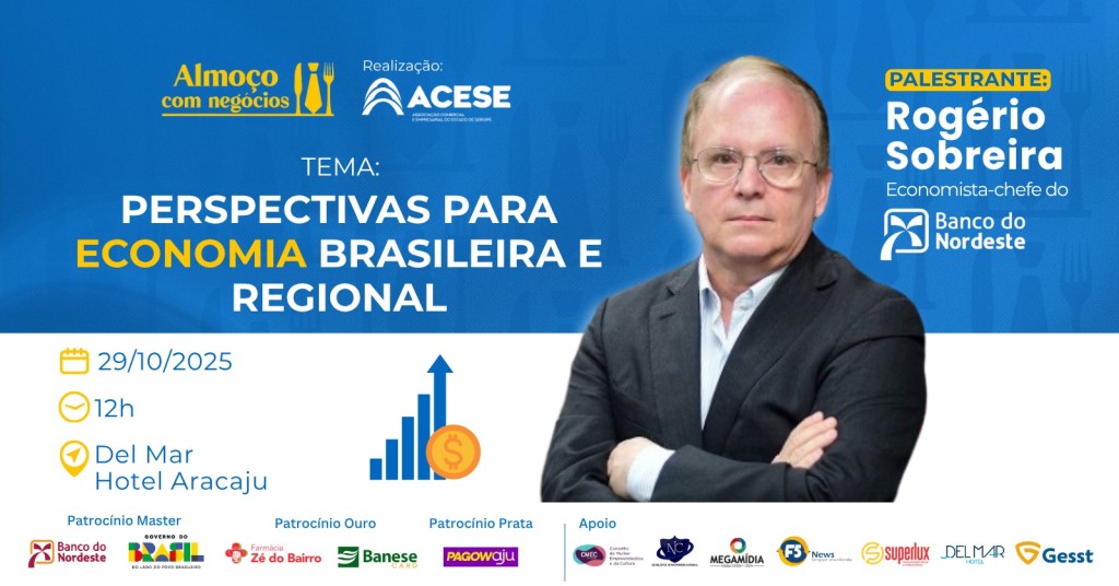 A 5ª dição do Almoço com Negócios da Associação Comercial e Empresarial de Sergipe (Acese) será realizada no dia 29 deste mês, no Del Mar Hotel. O próximo encontro trará o tema `Perspectivas para Economia Brasileira e Regional´, com o economista-chefe do Banco do Nordeste, Rogério Sobreira.